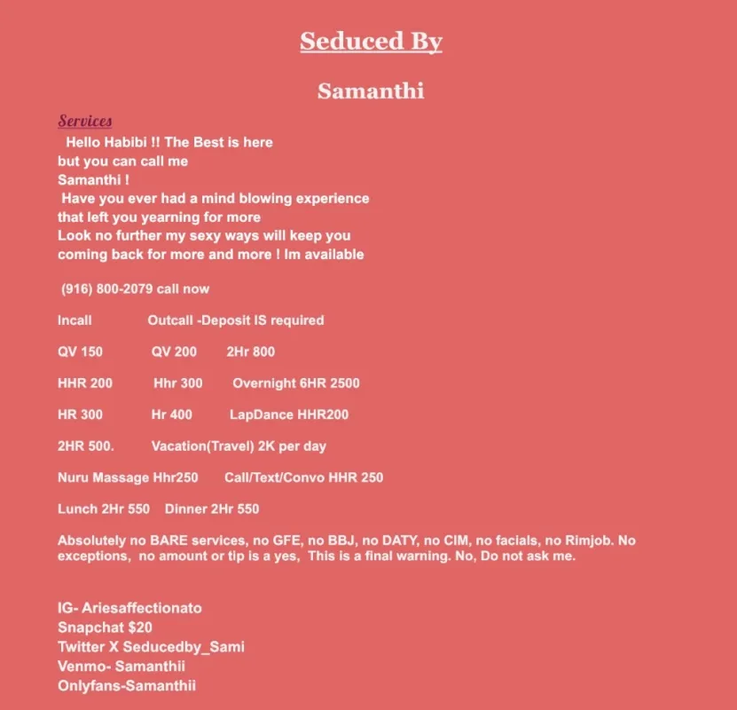 💦💦Read Throughly💦💦 texto en espanol🇲🇽 👅Text with your name, city, and desired time. 🍫Your Fantasy is here… Who Knew Chocolate was this Addictive 🍫🍫👅 Always complete Satisfaction Donation for Time: 🥀 150 QV | 220 HHR | 350 HR 🚗 Outcalls available for Serious Clients Only Be clean, be kind, be ready. No greek/gfe/bbj/daty/cim/kissing/No 📸Recording +300 👅STALK ME ADD ALL MY SOCIALS👅 💋Ig- Ariesaffectionato 💋OF- Samanthii 💋Twitter/X- Seducedby_Sami 💋
